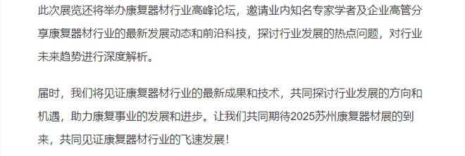 九游体育2025年苏州将举办一场盛大的康复器材展,届时将有来自全球的顶尖康复器材厂商和专业人士齐聚一堂,展示最新的康复器材产品和技术,探讨康复行业的发展趋势和前沿科技。本次展览将是康复器材行业的盛会,为康复行业的专业人士提供了一个交流合...